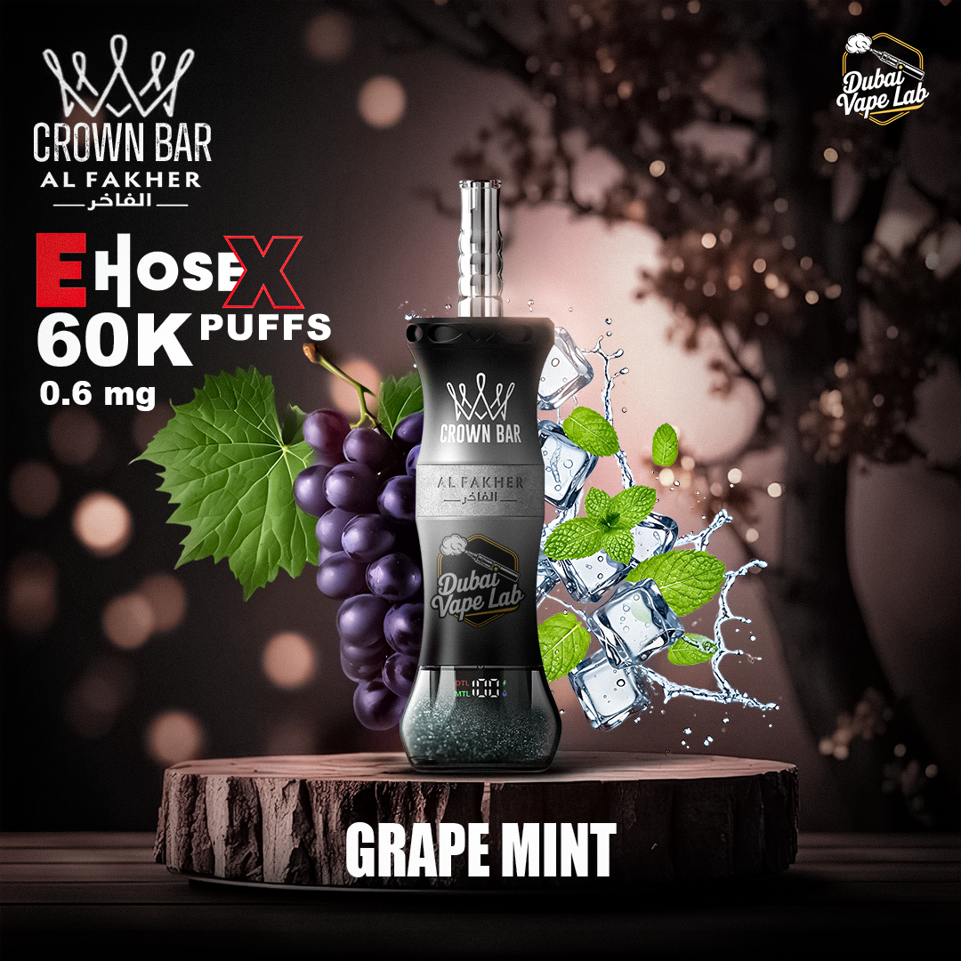 Crafted by Al Fakher Crown Bar, a brand widely associated with rich shisha flavors, the E Hose model features a generous 50ml e-liquid capacity paired with a 0.6% nicotine strength, offering a smooth and balanced hookah-inspired experience. The powerful 1000mAh rechargeable battery, supported by a USB Type-C charging port, ensures consistent performance across long sessions.